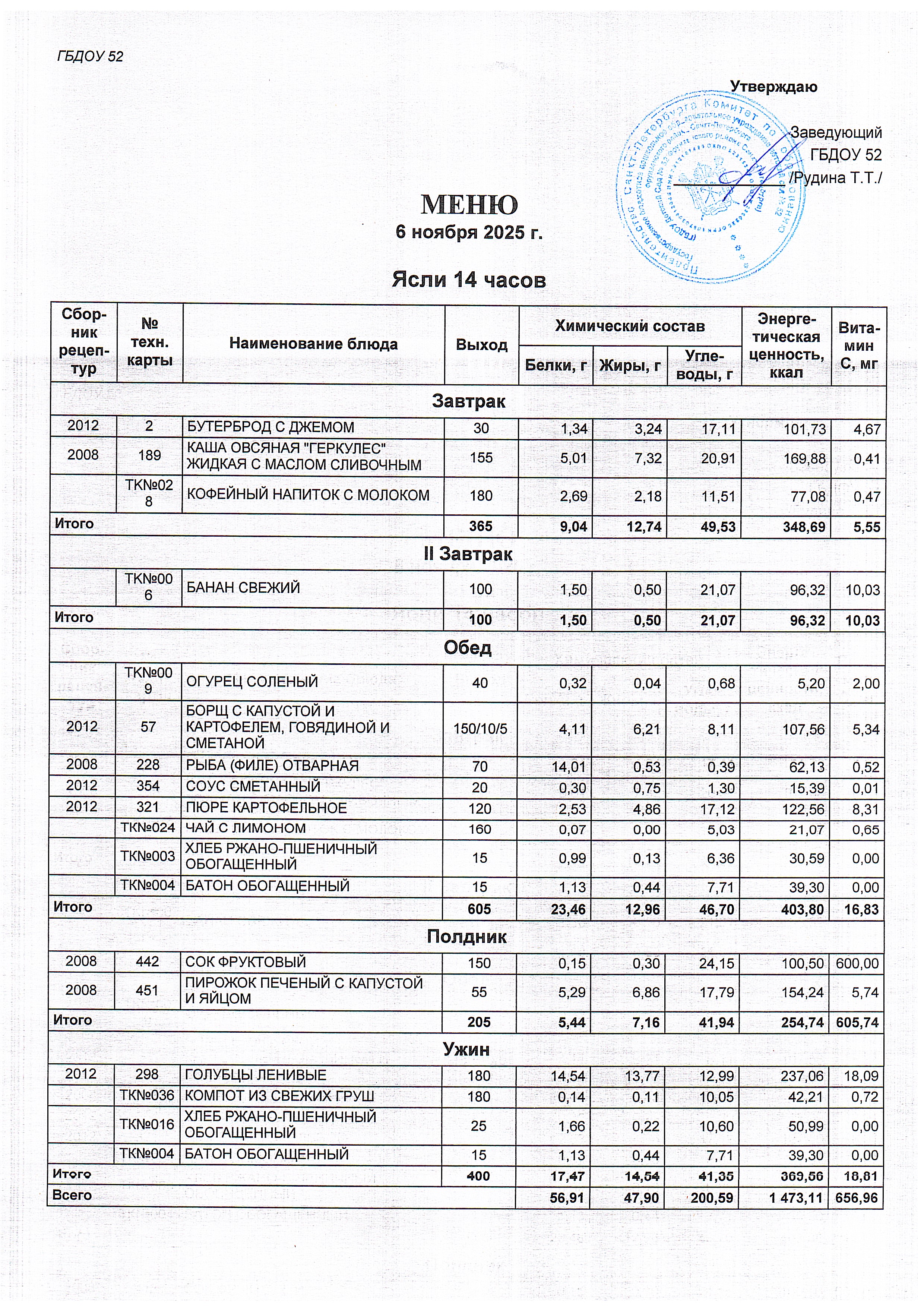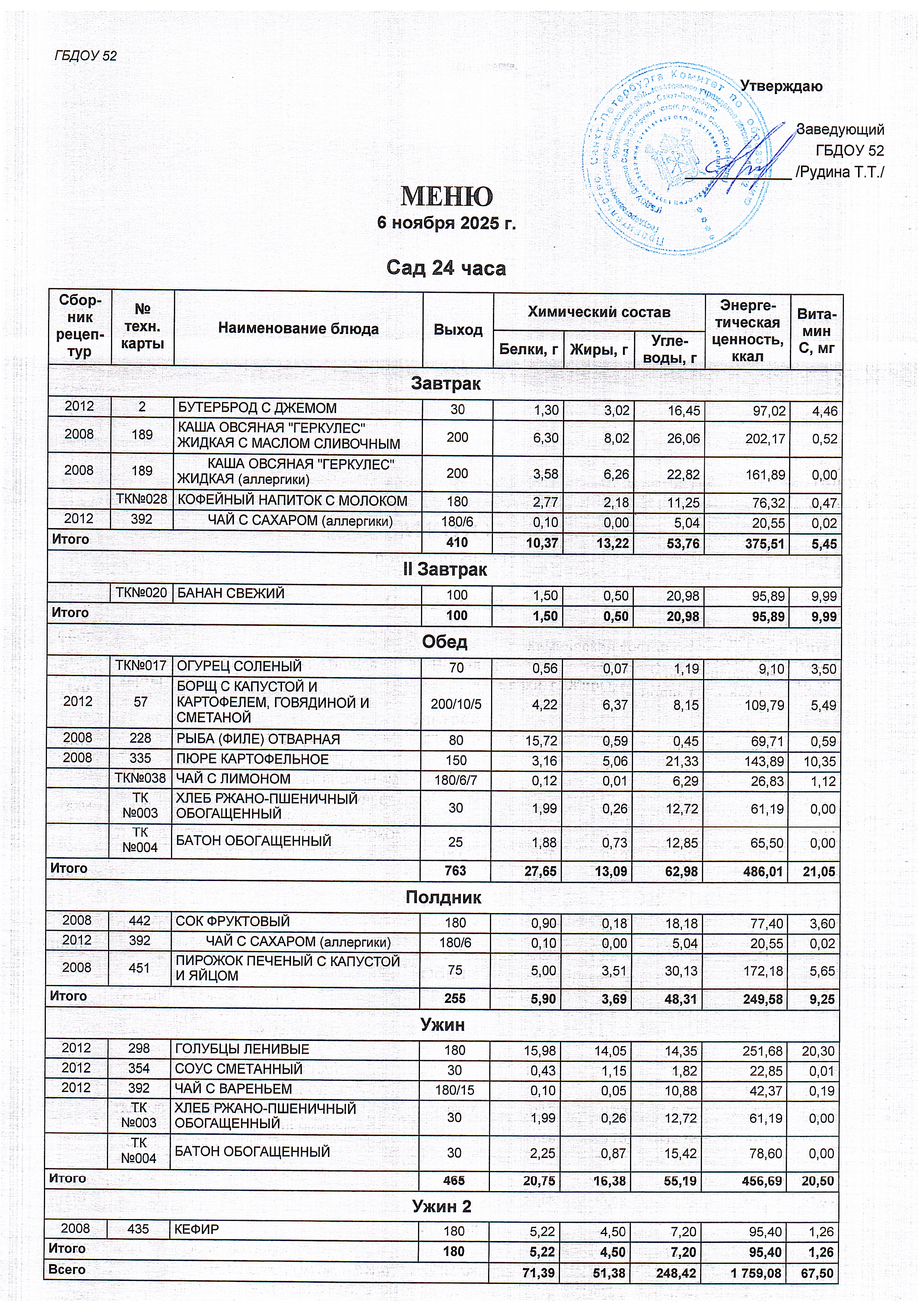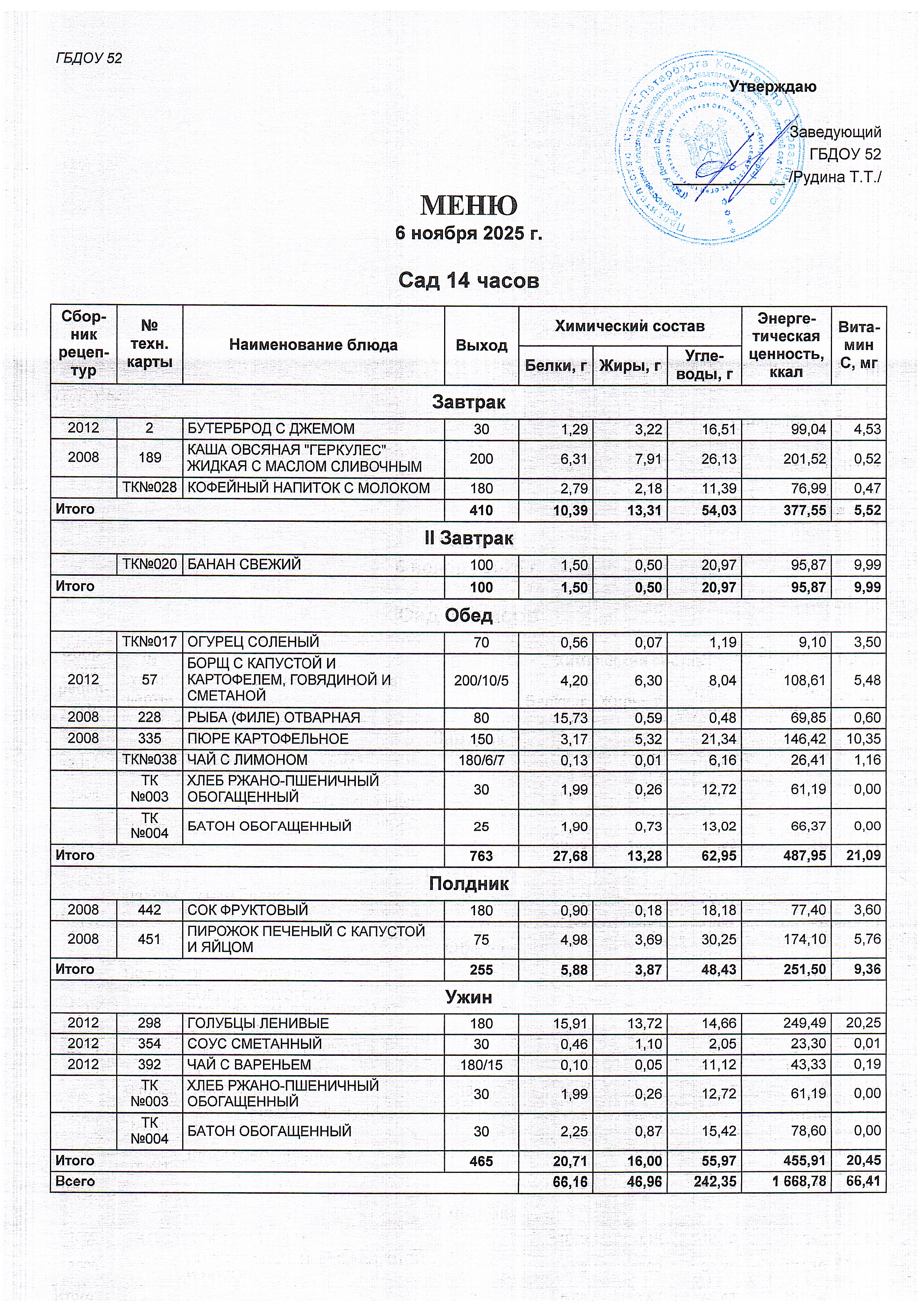 Меню ежедневного горячего питания (четверг, 6 ноября)
