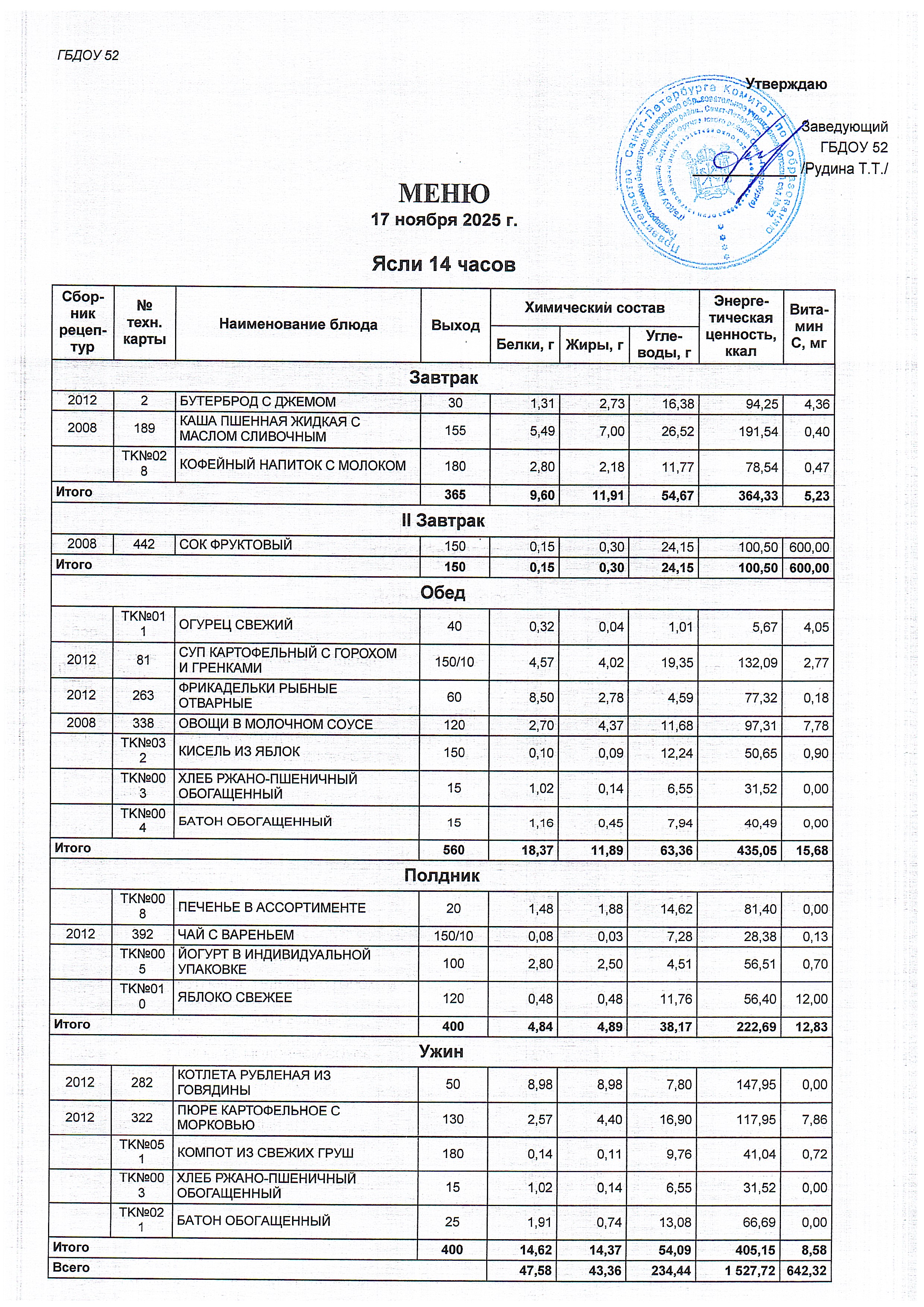 Меню ясли (14 часов) на 17.11.2025