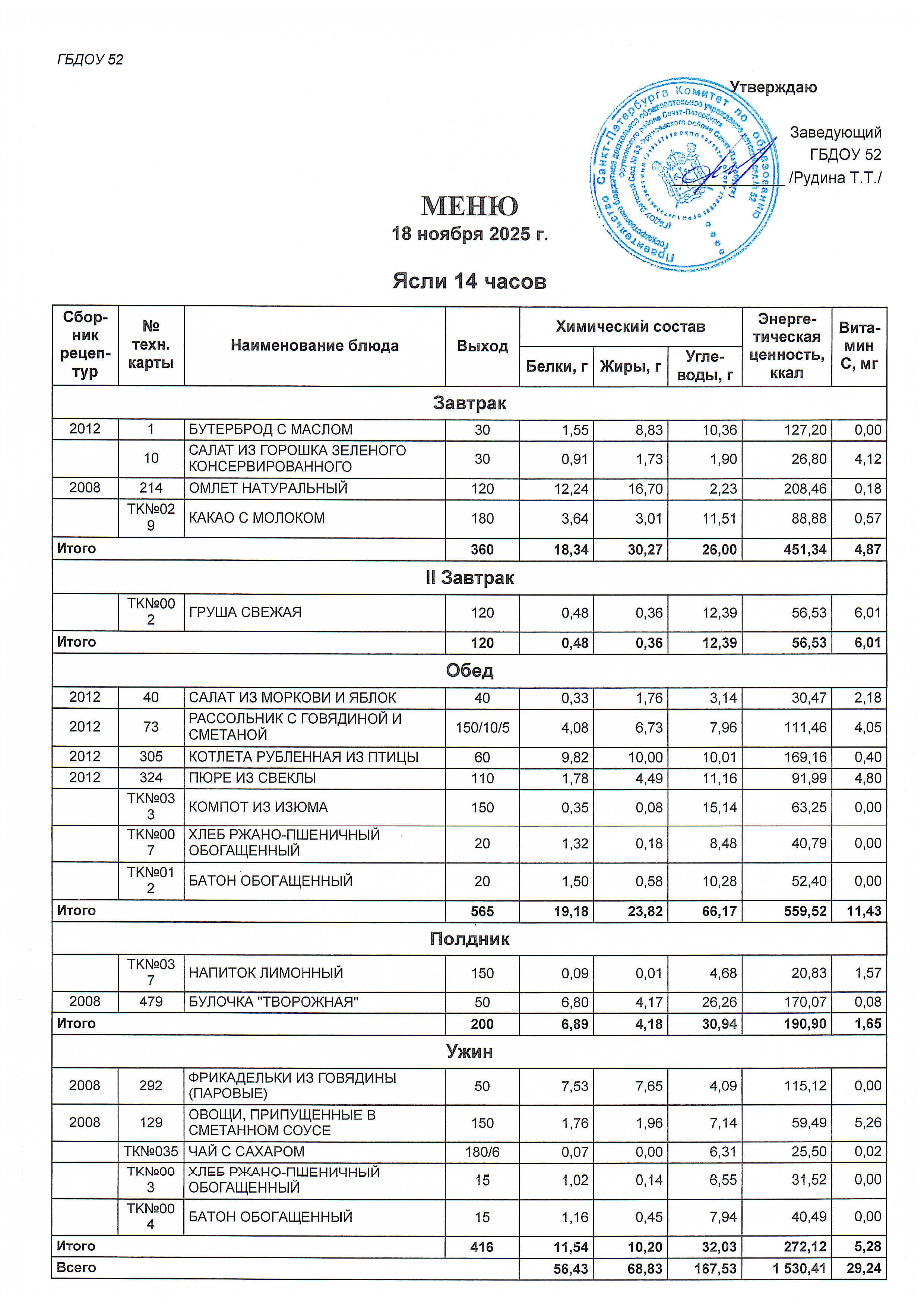 Меню ясли (14 часов) на 18.11.2025
