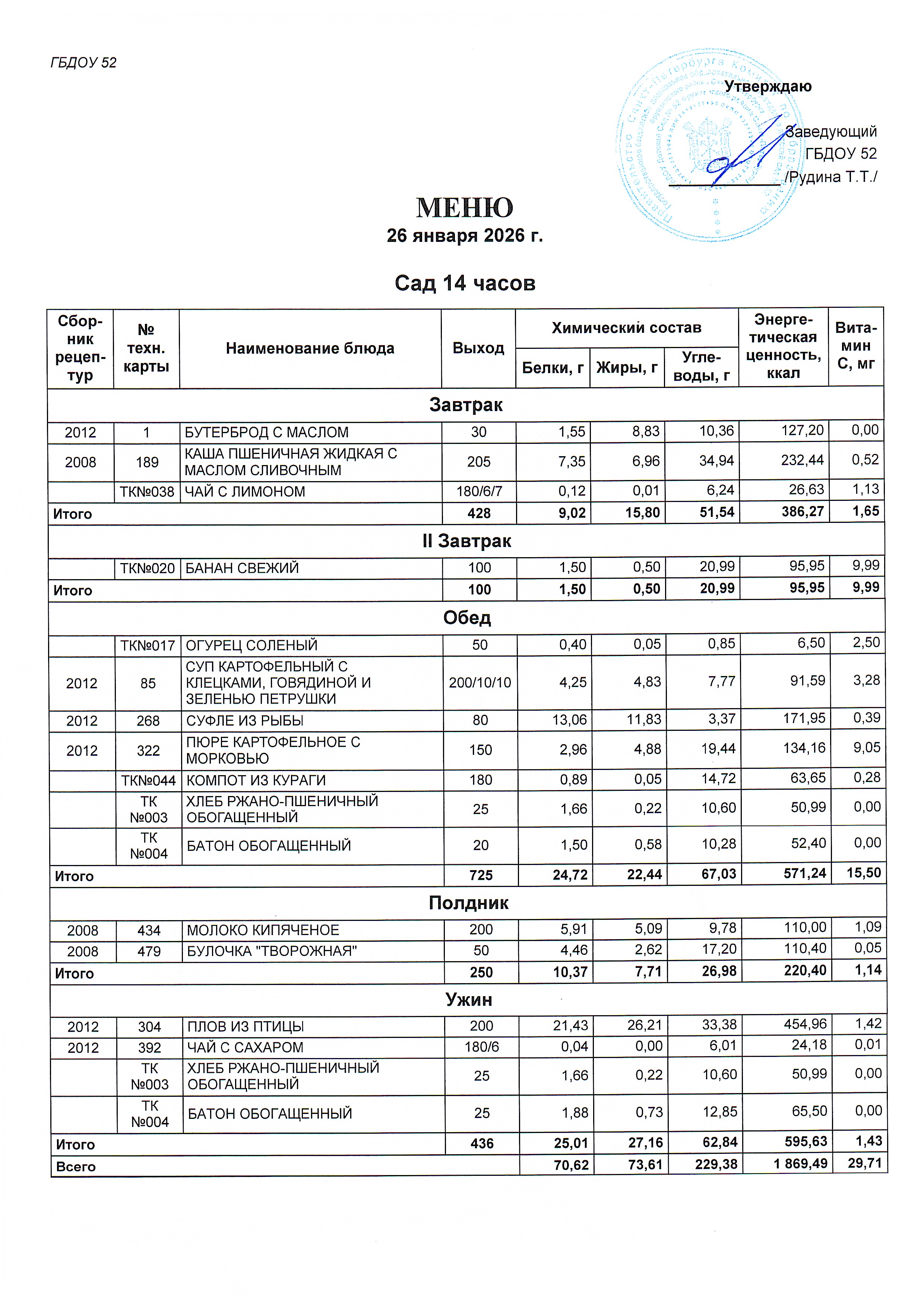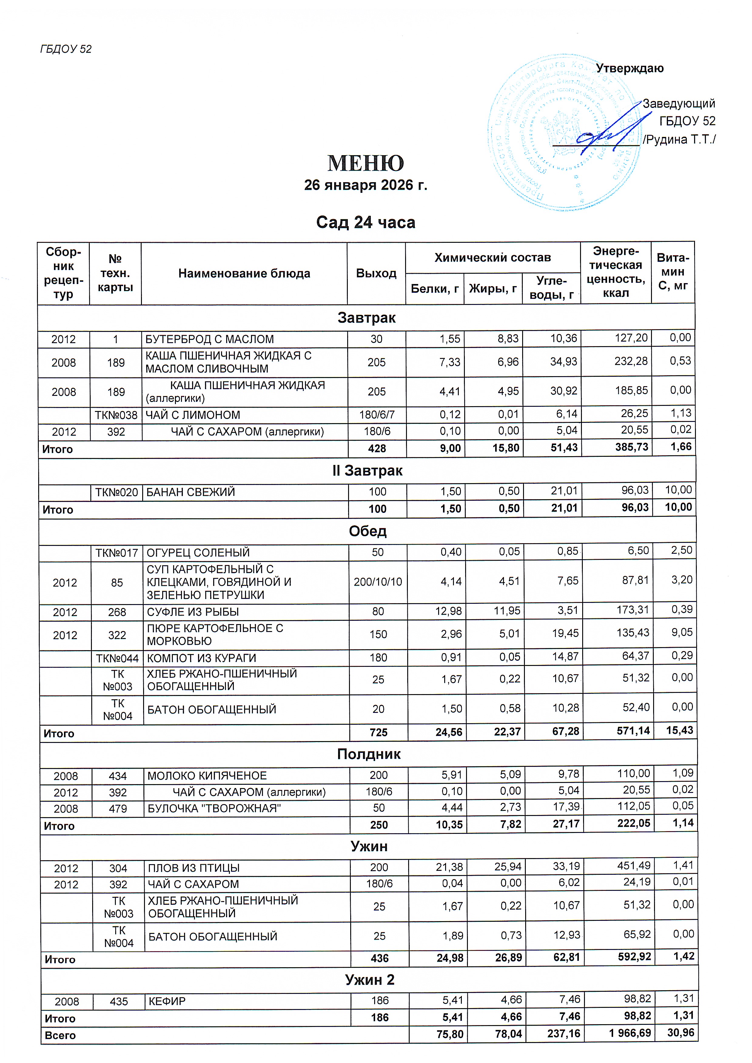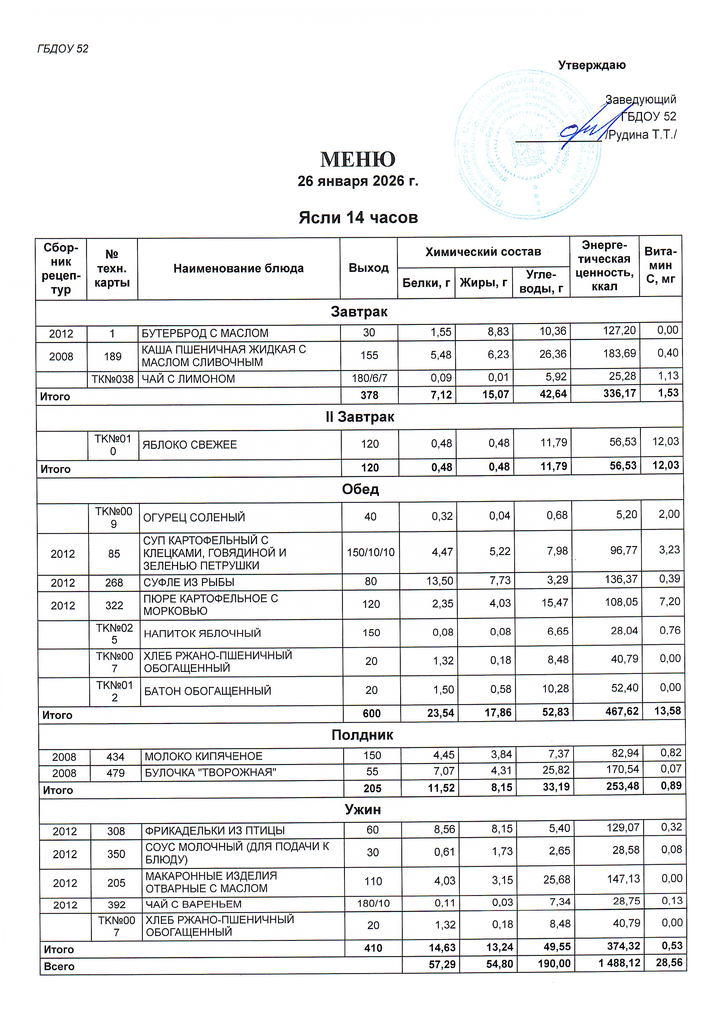Меню ежедневного горячего питания (понедельник, 26 января)