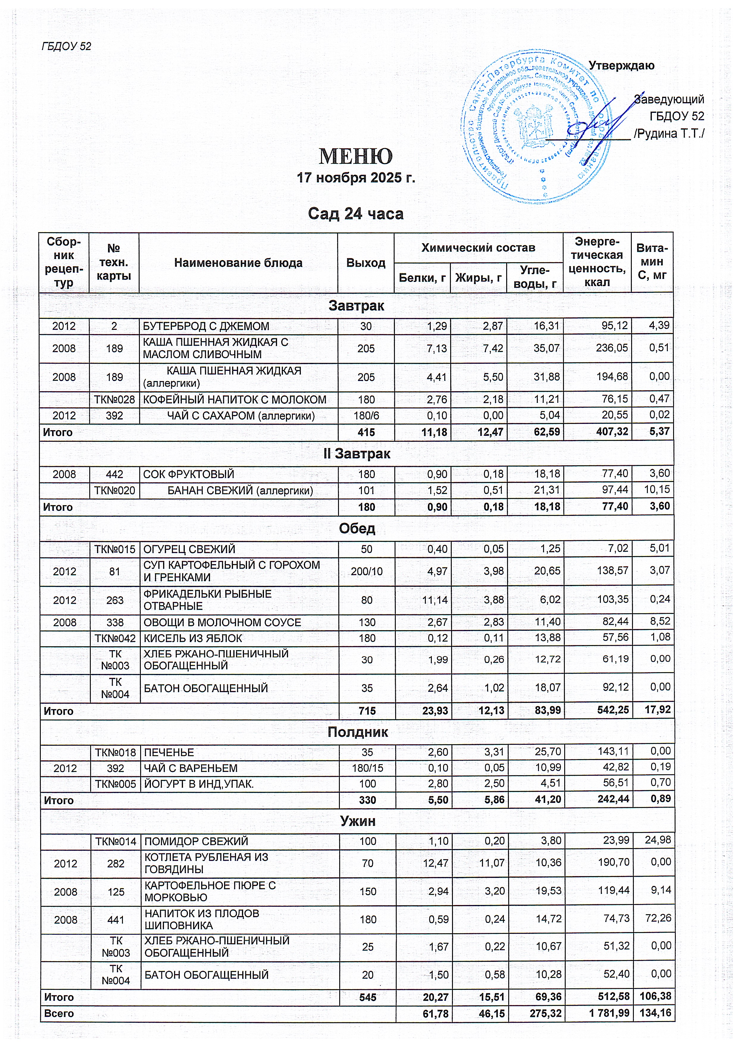Меню сад (24 часа) на 17.11.2025