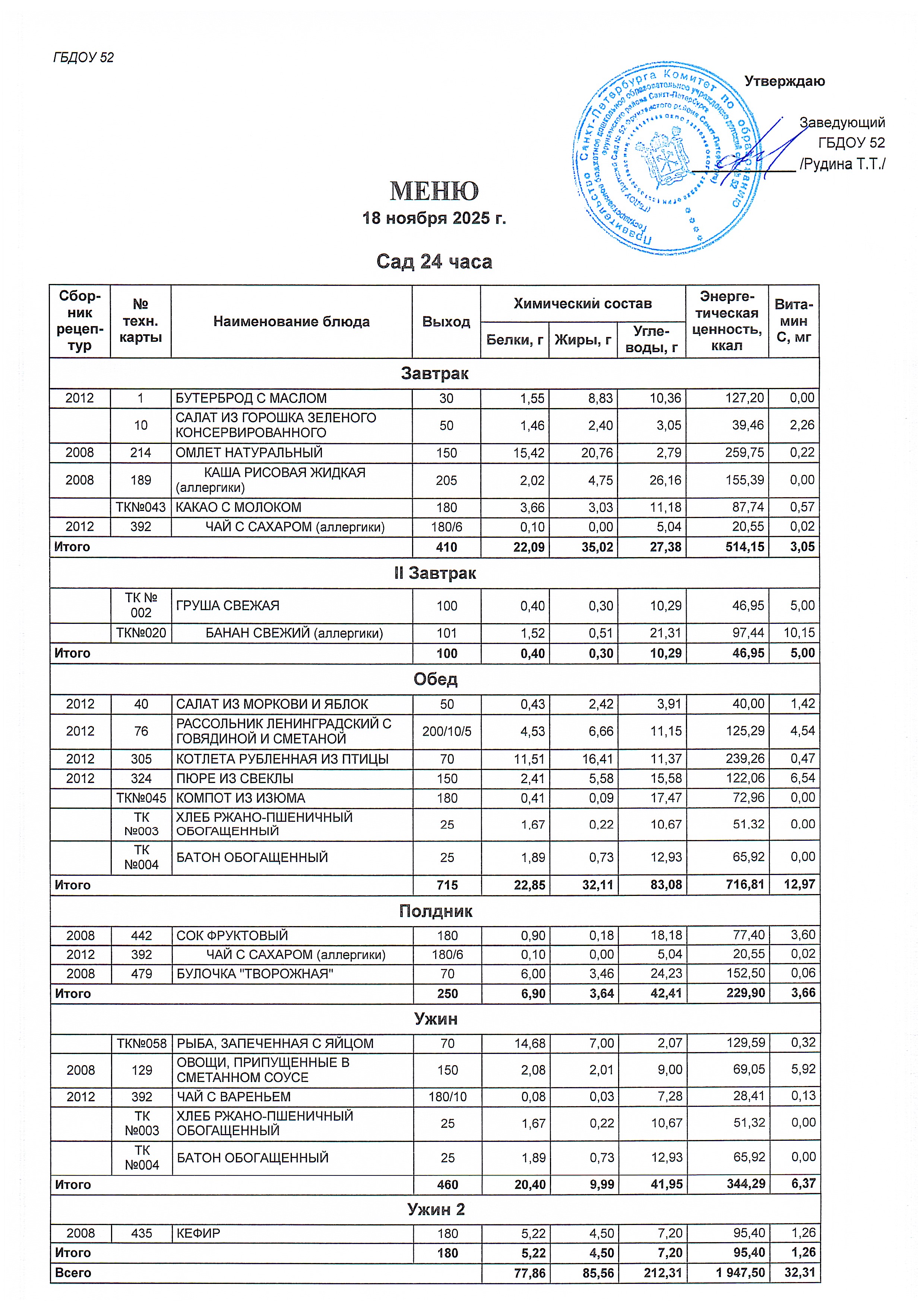 Меню сад (24 часа) на 18.11.2025
